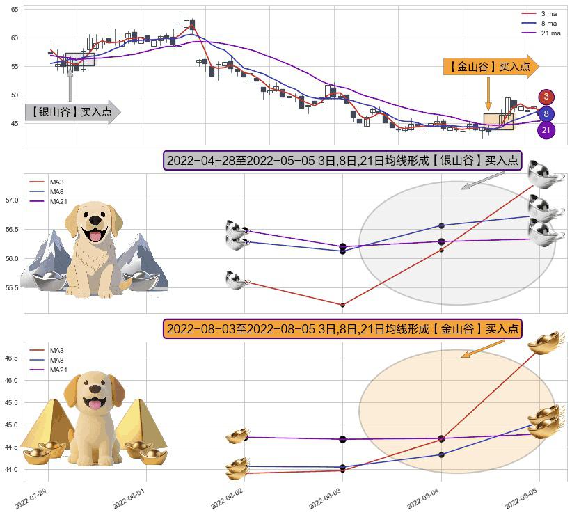 ⚀ 2022-08-04-日至2022-08-05-日显现 3日-8日-21日均线 【金山谷】买入点 其再次确认了买入信号,可靠性更强,买入