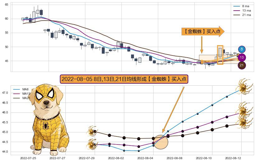 ⚀ 2022-08-05日显现 8日-13日-21日均线 【金蜘蛛】买入点 看多信号,后市看涨,买入