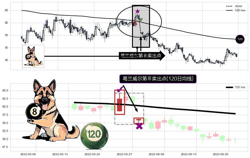 ⚀ 2022-05-30-日显现 葛兰威尔均线 120日均线 第⑧卖出点 下降趋势的中继信号,后市看跌,卖出信号