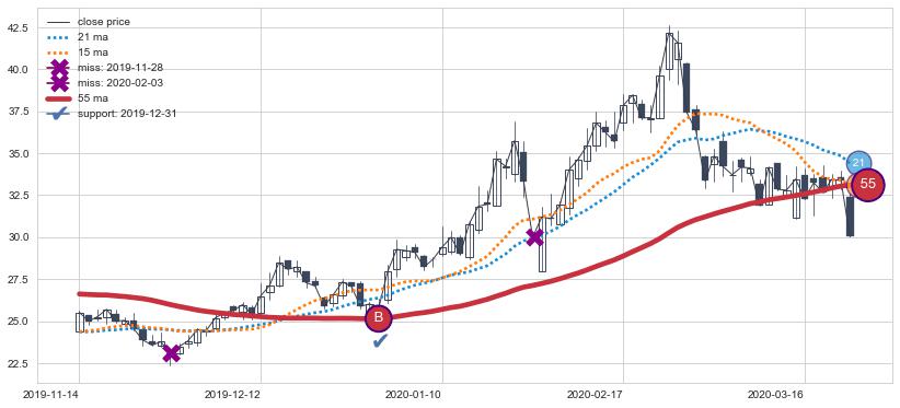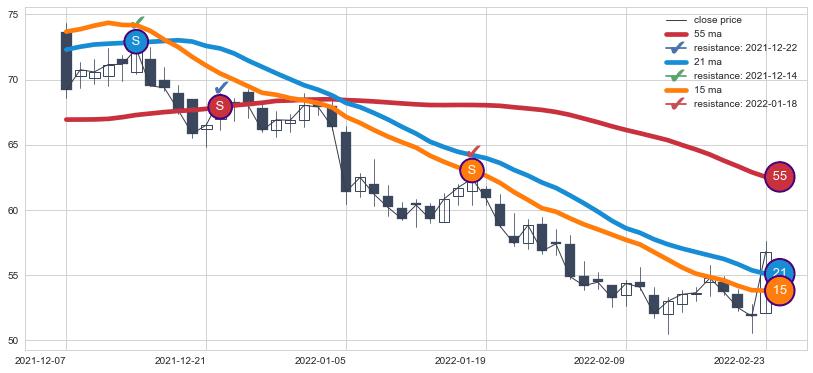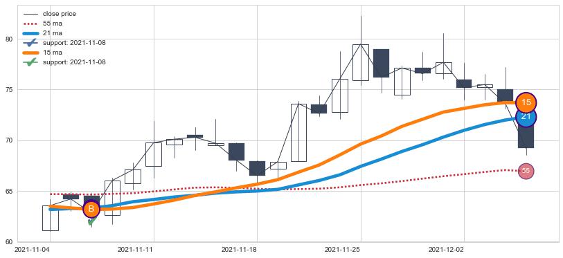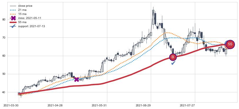⚁ MA3和MA8走势平行,且始终保持在短距离内,MA21始终在短中期均线上方,与短中期均线保持一定的距离,微微下行