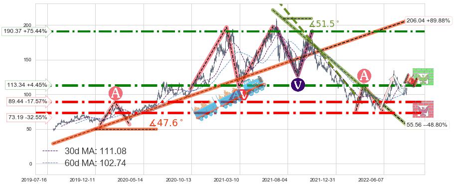 ♘ 阻力价格位113.34,可信任强度85.22%,距离最后交易2022-08-12形成的收盘价格108.51相差 +4.45%