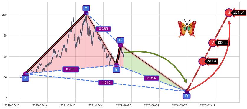 ➣ 未完成【蝴蝶】形态起点X: 2019-09-11, 已到达C点: 2022-07-06, 预测最终D点: 2024-04-30, 共1148交易日