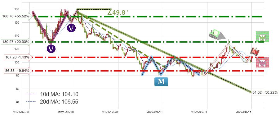 ♘ 支撑价格位107.28,可信任强度83.19%,距离最后交易2022-08-12形成的收盘价格108.51相差 -1.13%