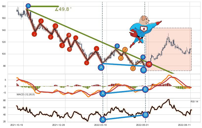 从2021-10-25至2022-03-23,共包含102个交易日,阶段股价下跌-48.75%,阶段股价变动位移路程比: 1 : 5,下跌趋势角度: 58.2