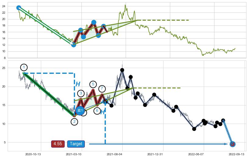 ➢ 最小中继整理跌幅→𝐇: 11.49 (𝐇楔型旗杆的长度:楔型起点→顶点)