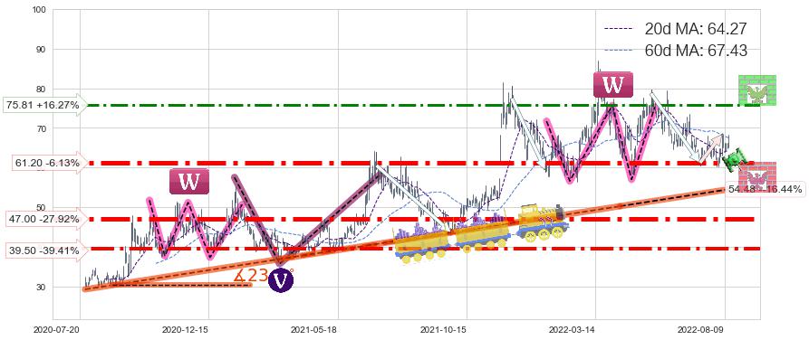 ♘ 支撑价格位61.20,可信任强度89.41%,距离最后交易2022-08-12形成的收盘价格65.20相差 -6.13%