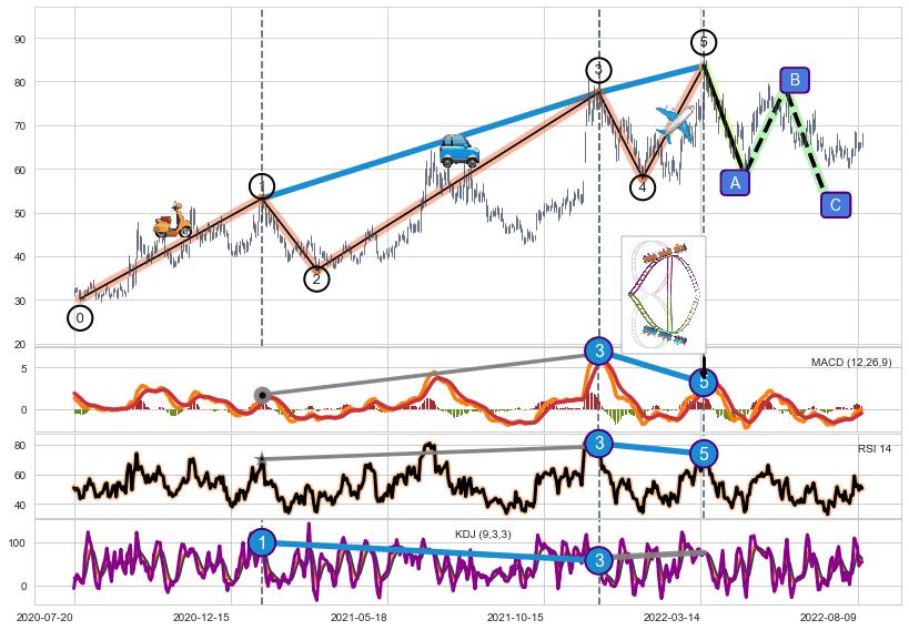 ➣ 1,3,5驱动浪MACD, RSI, KDJ走势都出现【常规背离】反转信号增强