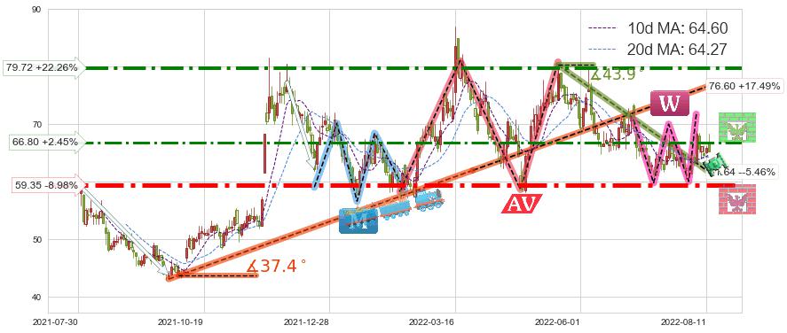 ⚔️ 2022-05-19-2022-08-04下跌趋势存在反转上涨[机会],其原下跌趋势的阻力位(61.64)已被突破[强支撑信号],原下跌趋势角度: 43.9˚