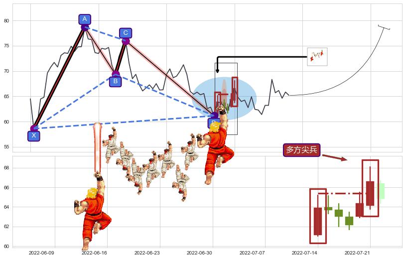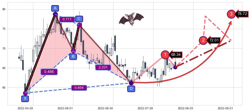 ➣ 已完成【蝙蝠】形态起点X: 2022-04-25, 终点D: 2022-07-13, 共54交易日
