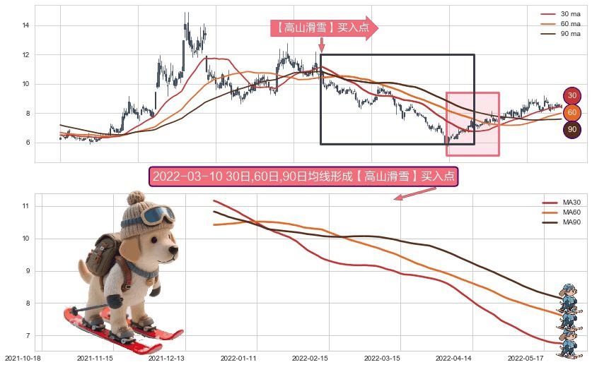 形态多维评估: ⚀ 2021-12-23日-2022-05-24日显现 30日-60日-90日均线 【高山滑雪】买入点 看多信号,后市看涨,买入