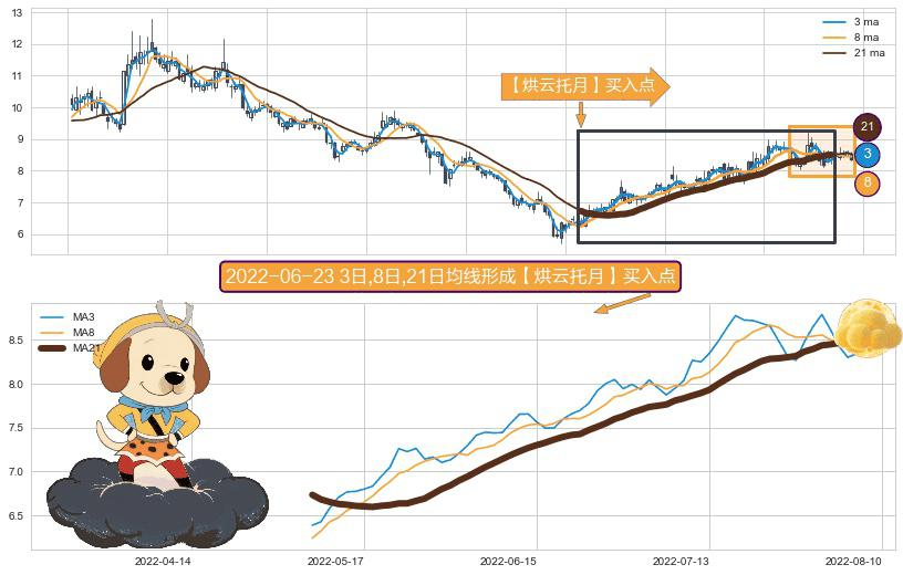 形态多维评估: ⚀ 2022-05-09日-2022-08-05日显现 3日-8日-21日均线 【烘云托月】买入点 看多信号,后市看涨,买入