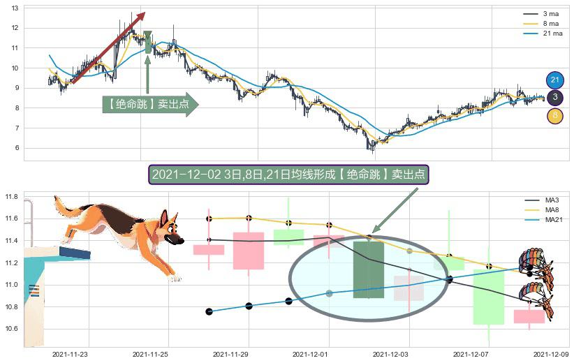 形态多维评估: ⚀ 2021-12-02日显现 3日-8日-21日均线 【绝命跳】卖出点 看空信号,后市看跌,卖出