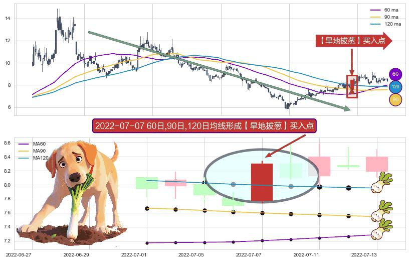 形态多维评估: ⚀ 2022-07-07日显现 60日-90日-120日均线 【旱地拔葱】买入点 看多信号,后市看涨,买入