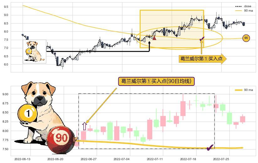 形态多维评估: ⚀ 2022-06-23-日显现 葛兰威尔均线 90日均线 第买①入点 走势反转见底信号,后市看涨,买进信号