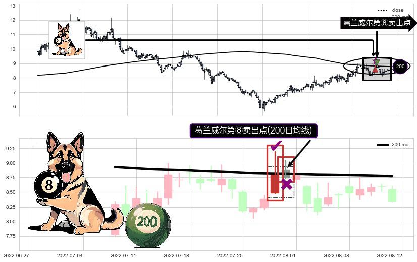 形态多维评估: ⚀ 2022-07-29-日显现 葛兰威尔均线 200日均线 第⑧卖出点 下降趋势的中继信号,后市看跌,卖出信号