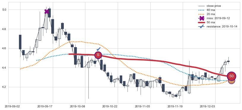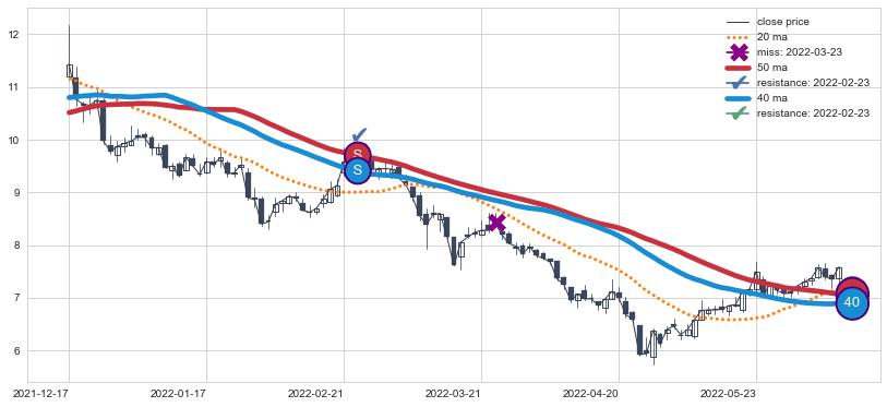 下跌趋势2021-12-17-2022-06-09,均线40, 50确认关键阻力1处
