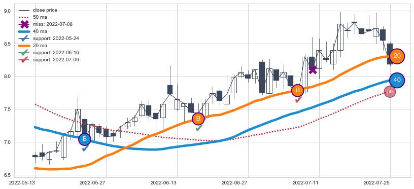 上涨趋势2022-05-13-2022-07-25,均线40, 20确认关键支撑3处