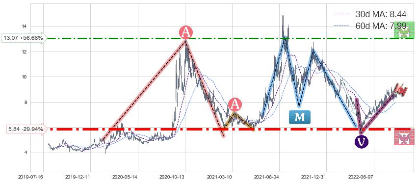 ♘ 阻力价格位13.07,可信任强度67.45%,距离最后交易2022-08-12形成的收盘价格8.34相差 +56.66%