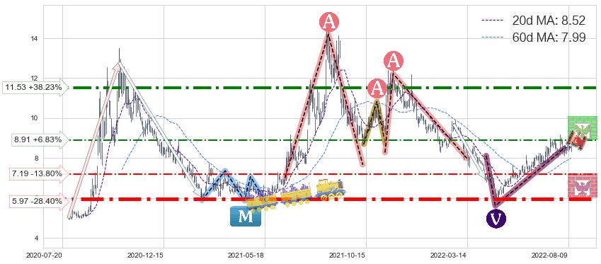 ♘ 阻力价格位11.53,可信任强度72.14%,距离最后交易2022-08-12形成的收盘价格8.34相差 +38.23%