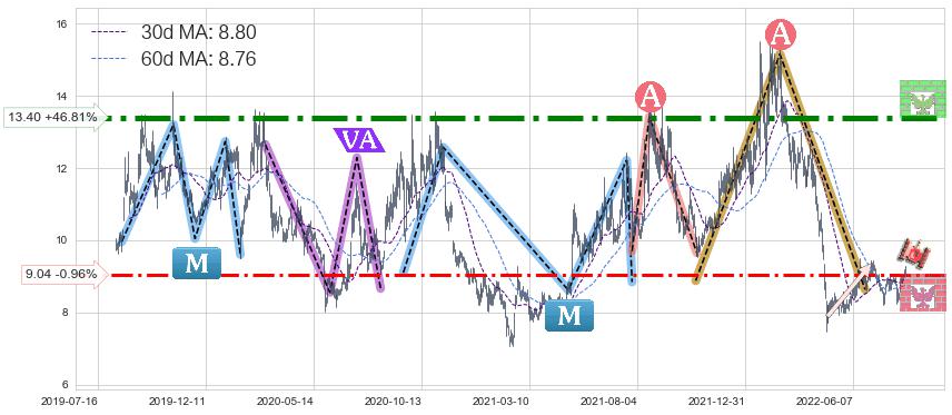 ♘ 支撑价格位9.04,可信任强度59.33%,距离最后交易2022-08-12形成的收盘价格9.13相差 -0.96%