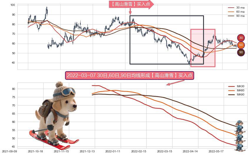 ⚀ 2021-12-09日-2022-05-31日显现 30日-60日-90日均线 【高山滑雪】买入点 看多信号,后市看涨,买入