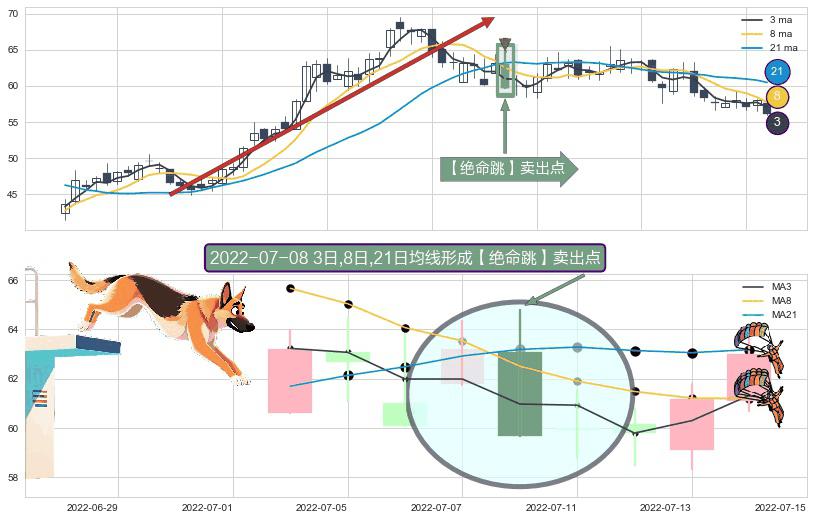 ⚀ 2022-07-08日显现 3日-8日-21日均线 【绝命跳】卖出点 看空信号,后市看跌,卖出
