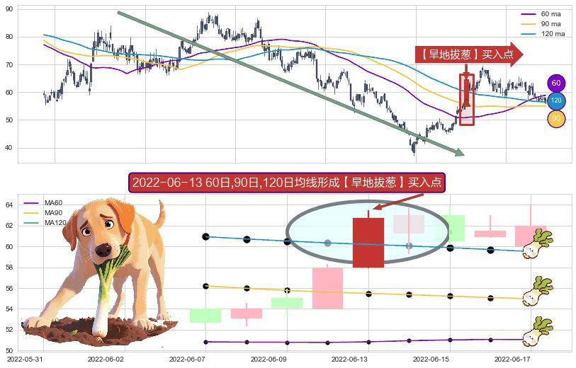 ⚀ 2022-06-13日显现 60日-90日-120日均线 【旱地拔葱】买入点 看多信号,后市看涨,买入