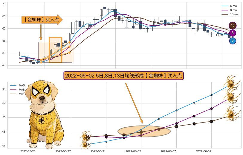 ⚀ 2022-06-02日显现 5日-8日-13日均线 【金蜘蛛】买入点 看多信号,后市看涨,买入