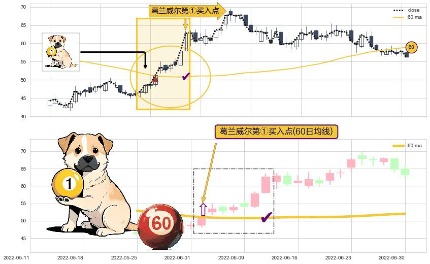 ⚀ 2022-06-02-日显现 葛兰威尔均线 60日均线 第买①入点 走势反转见底信号,后市看涨,买进信号