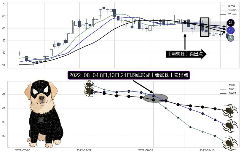 ⚀ 2022-08-04日显现 8日-13日-21日均线 【毒蜘蛛】卖出点 看空信号,后市看跌,卖出
