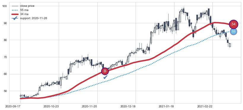 ⚀ 中期均线MA13下穿长期均线MA21形成的交叉是标准 死亡交叉