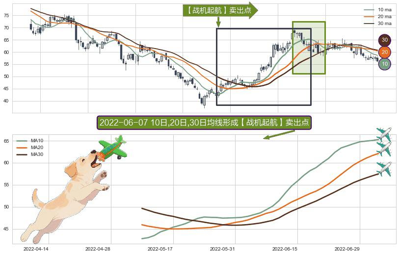 ⚀ 2022-05-10日-2022-07-04日显现 10日-20日-30日均线 【战机起航】卖出点 看空信号,后市看跌,卖出