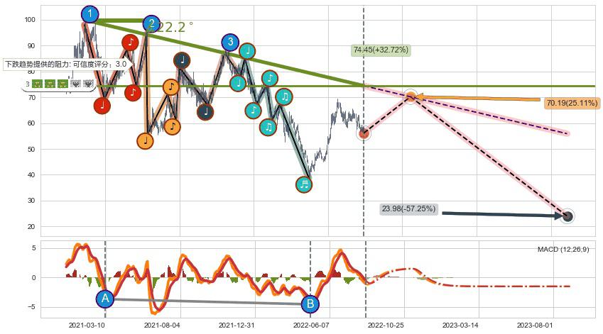 ♘ 在最后的下跌阶段2021-01-22至2022-06-13,存在 持续未破位的阻力位 ,阻力价格74.45,可信任强度74.68%,其距离最后价格56.10相差 +32.72%