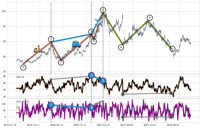 ➢ 第一, 三驱动浪端点:【KDJ】走势出现【常规背离 & 反转信号】背离程度30.43%,背离夹角角度38.9˚,背离程度较小