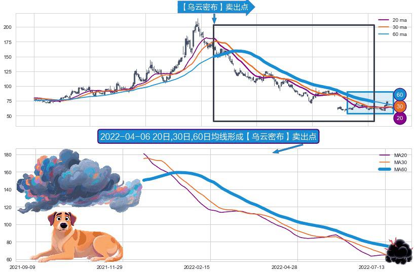 ⚀ 2021-12-15日-2022-07-20日显现 20日-30日-60日均线 【乌云密布】卖出点 看空信号,后市看跌,卖出