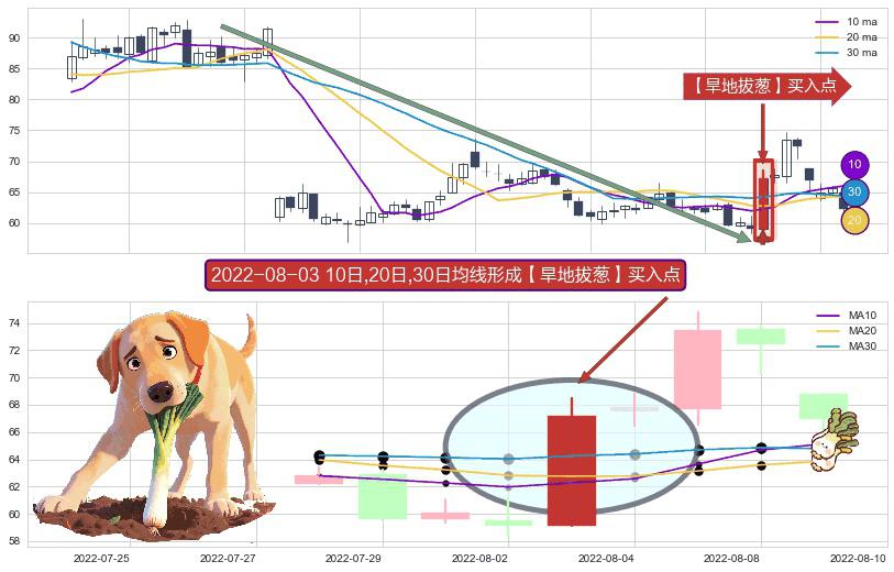 ⚀ 2022-08-03日显现 10日-20日-30日均线 【旱地拔葱】买入点 看多信号,后市看涨,买入