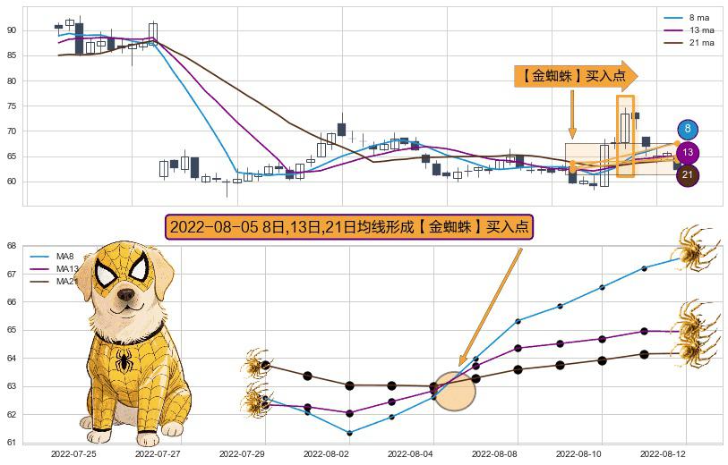 ⚀ 2022-08-05日显现 8日-13日-21日均线 【金蜘蛛】买入点 看多信号,后市看涨,买入