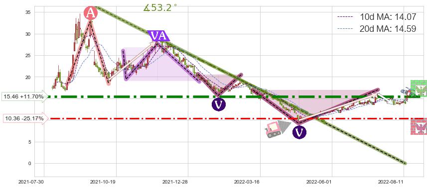 ♘ 阻力价格位15.46,可信任强度86.27%,距离最后交易2022-08-12形成的收盘价格13.84相差 +11.70%