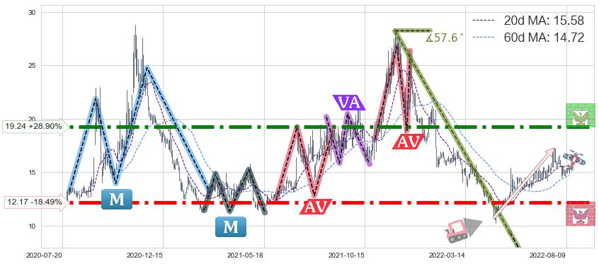 ♘ 阻力价格位19.24,可信任强度94.79%,距离最后交易2022-08-12形成的收盘价格14.93相差 +28.90%