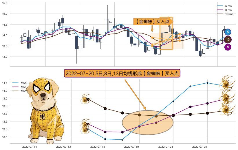 形态多维评估: ⚀ 2022-07-20日显现 5日-8日-13日均线 【金蜘蛛】买入点 看多信号,后市看涨,买入