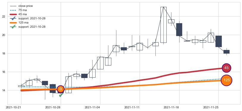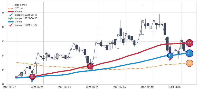 上涨趋势2021-05-07-2021-08-04,均线75, 45确认关键支撑3处