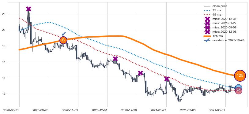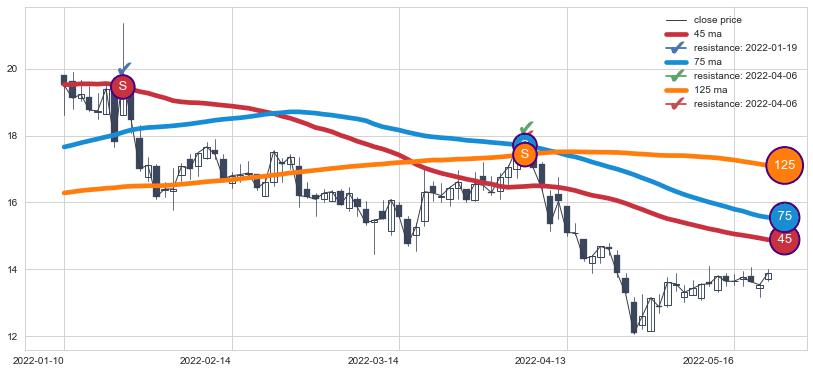 下跌趋势2022-01-10-2022-05-20,均线125, 75, 45确认关键阻力2处