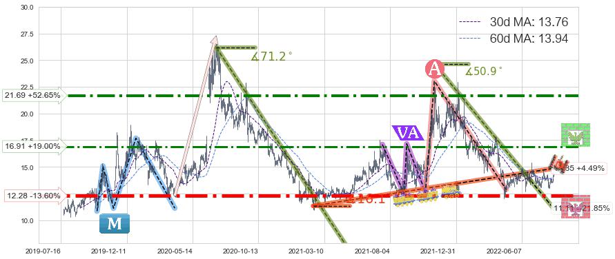 ♘ 阻力价格位16.91,可信任强度62.72%,距离最后交易2022-08-12形成的收盘价格14.21相差 +19.00%