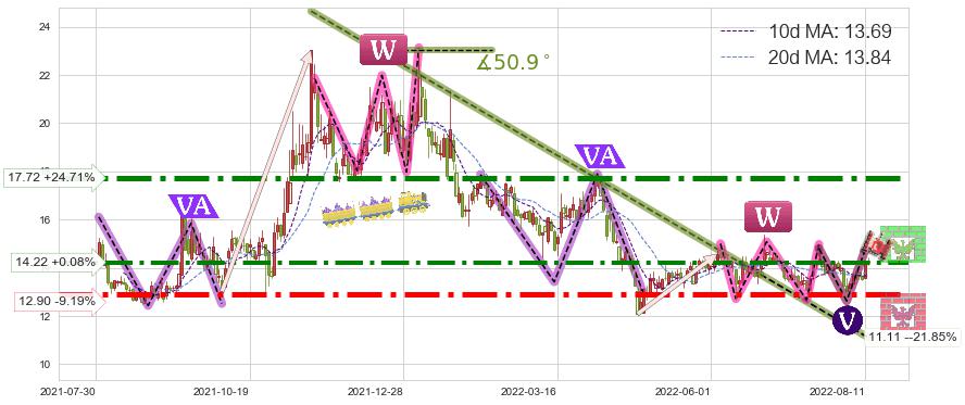 ♘ 阻力价格位17.72,可信任强度92.15%,距离最后交易2022-08-12形成的收盘价格14.21相差 +24.71%