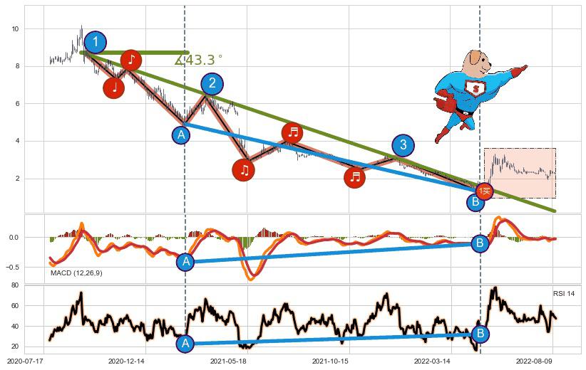 ➣ 【RSI】下跌趋势出现【常规背离 & 反转信号】背离程度14.76%,背离夹角角度47.4˚,背离程度较小