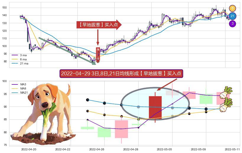 形态多维评估: ⚀ 2022-04-29日显现 3日-8日-21日均线 【旱地拔葱】买入点 看多信号,后市看涨,买入