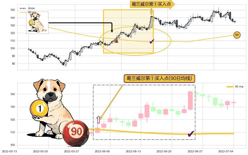 形态多维评估: ⚀ 2022-06-01-日显现 葛兰威尔均线 90日均线 第买①入点 走势反转见底信号,后市看涨,买进信号