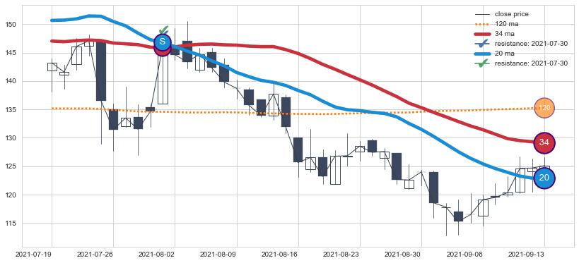 下跌趋势2021-07-19-2021-09-13,均线34, 20确认关键阻力1处