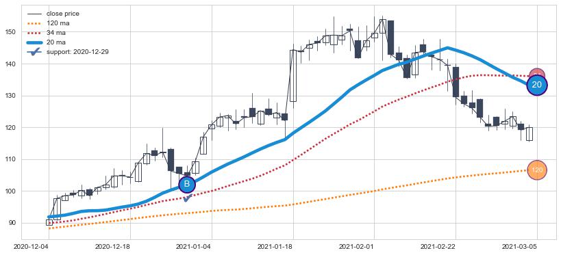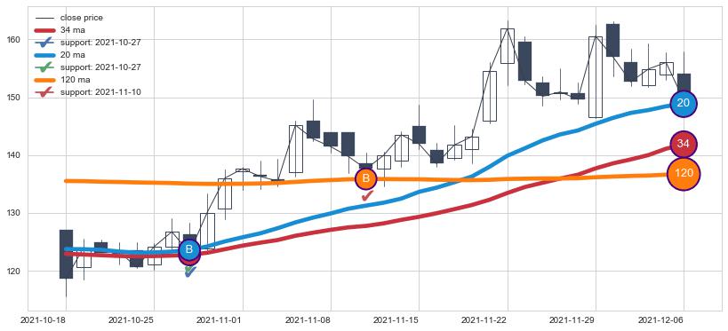 上涨趋势2021-10-18-2021-12-06,均线120, 34, 20确认关键支撑2处