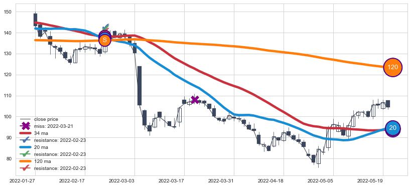 下跌趋势2022-01-27-2022-05-20,均线120, 34, 20确认关键阻力1处